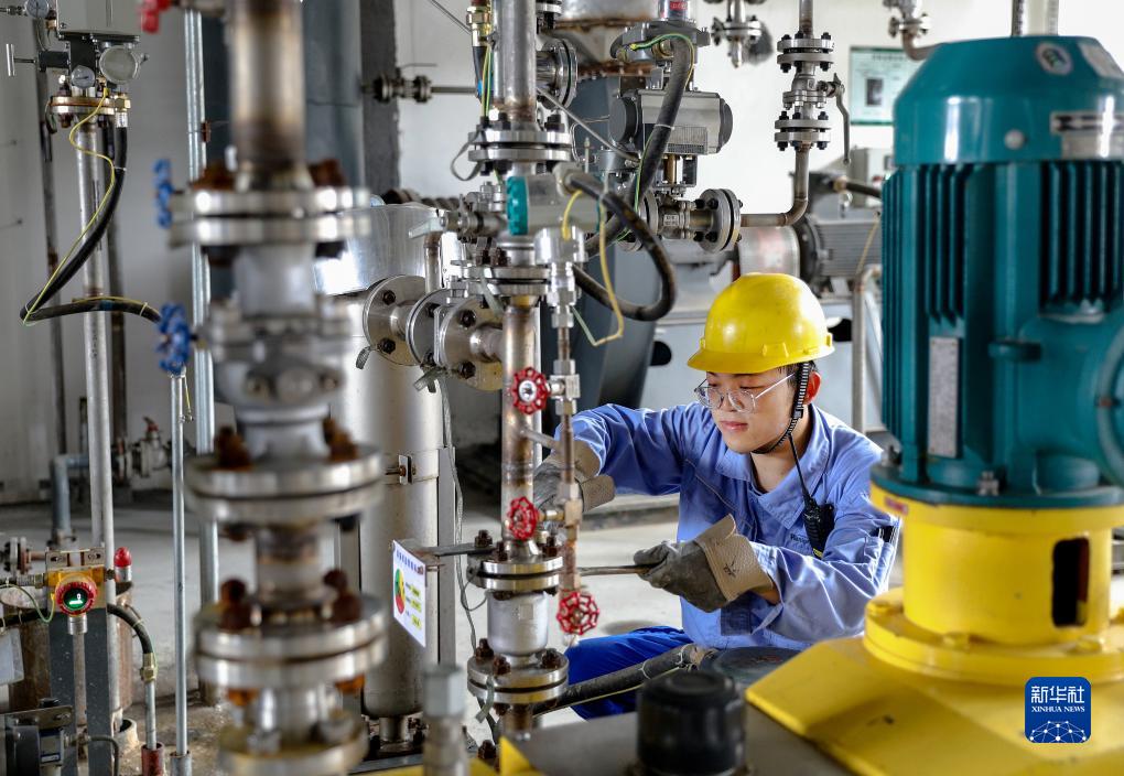8月15日,河北衡水高新技術産業開發區一家新材料生産企業的工人在生産車間內維護生産設備。
