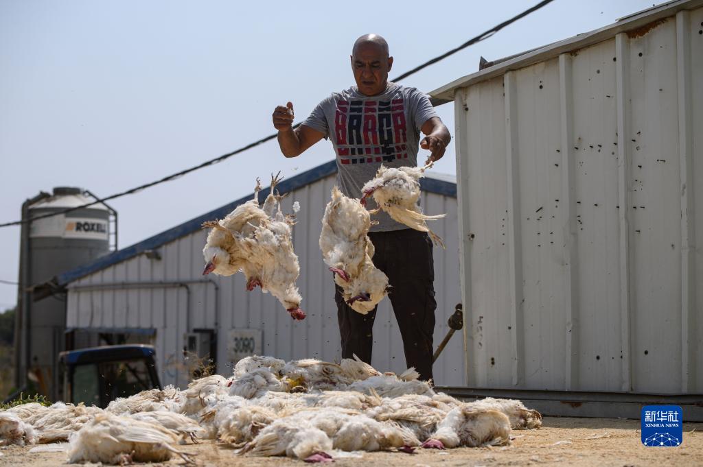 8月14日,在以色列北部馬爾加利奧特村一養雞場,一名男子處理熱死的雞。