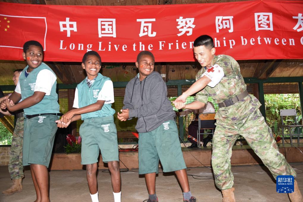 8月11日,中國海軍“和平方舟”號人員在瓦努阿圖的一所學校教學生們跳“洗手操”。