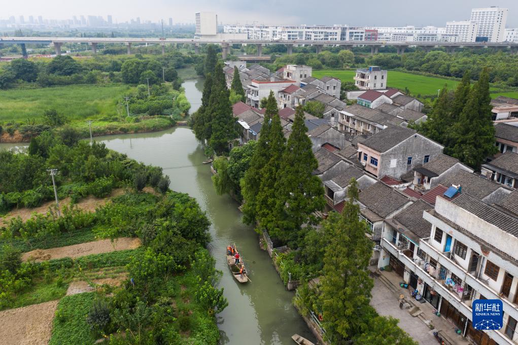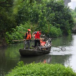 8月15日,在織裏鎮港西村楊家埭河段,黨員志願者和村民在河道做日常水體保潔(無人機照片)。