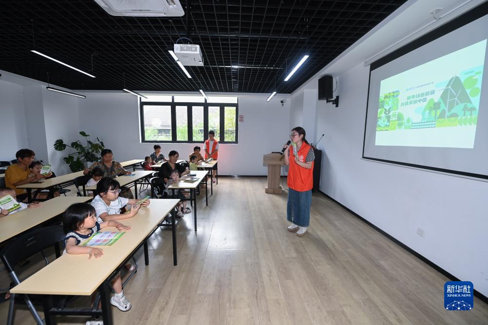 8月15日,在織裏鎮港西村文化禮堂內,黨員志願者給孩子們普及生態保護知識。
