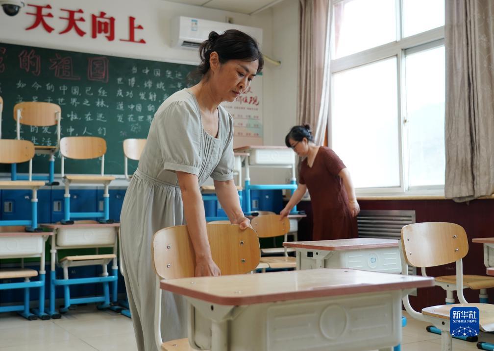8月14日,北京市門頭溝區妙峰山民族學校的工作人員在佈置教室。