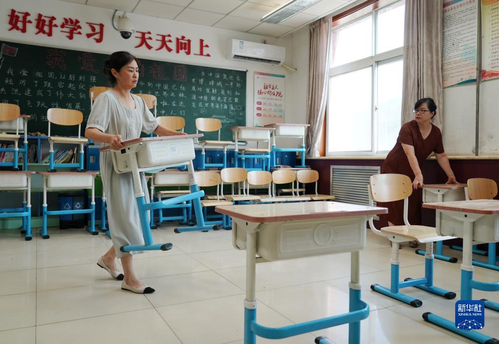8月14日,北京市門頭溝區妙峰山民族學校的工作人員在佈置教室。