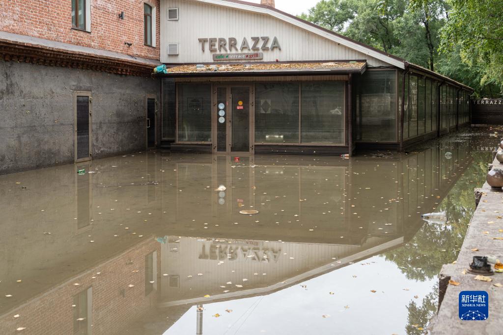 這是8月15日在俄羅斯烏蘇裏斯克市拍攝的被洪水圍困的一家餐廳。