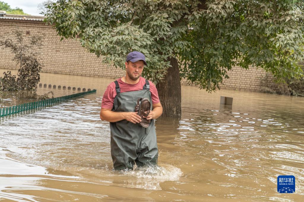 8月15日,在俄羅斯烏蘇裏斯克市,一名男子在洪水中行走。