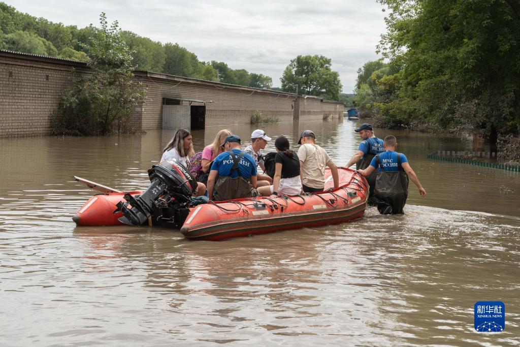8月15日,在俄羅斯烏蘇裏斯克市,救援人員幫助受災居民出行。