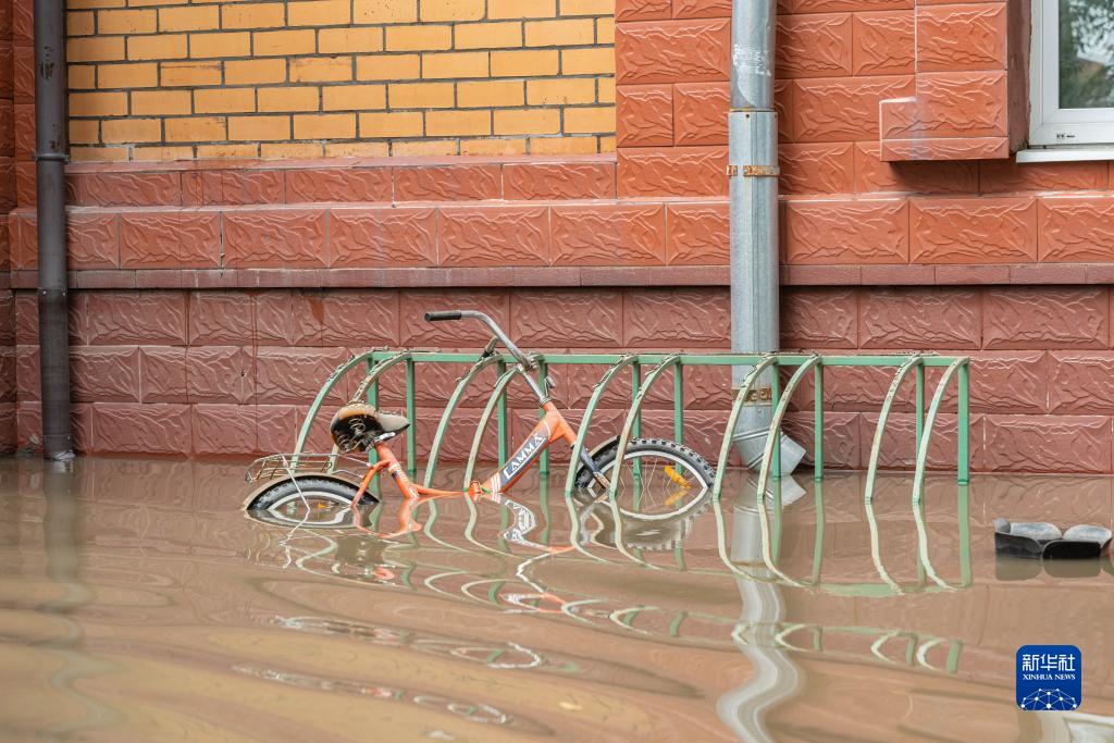 這是8月15日在俄羅斯烏蘇裏斯克市拍攝的泡在洪水中的自行車。