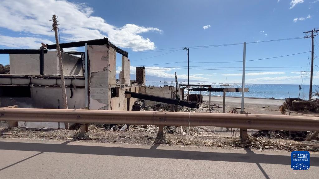 這是8月14日在美國夏威夷州毛伊島拉海納拍攝的野火燒燬的建築殘骸。