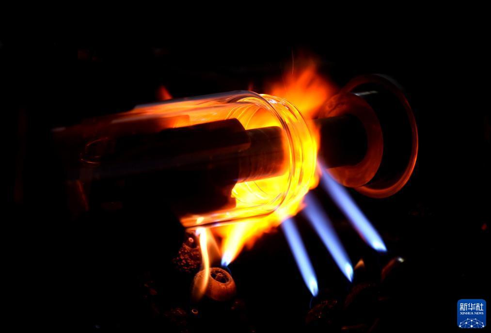 這是8月15日在山東省淄博市沂源縣悅莊鎮東埠村一玻璃製品企業拍攝的玻璃工藝品燒制加工場景。