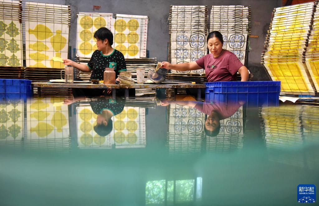 8月15日,在山東省淄博市沂源縣悅莊鎮東埠村一玻璃製品企業,工人對玻璃進行貼畫加工。