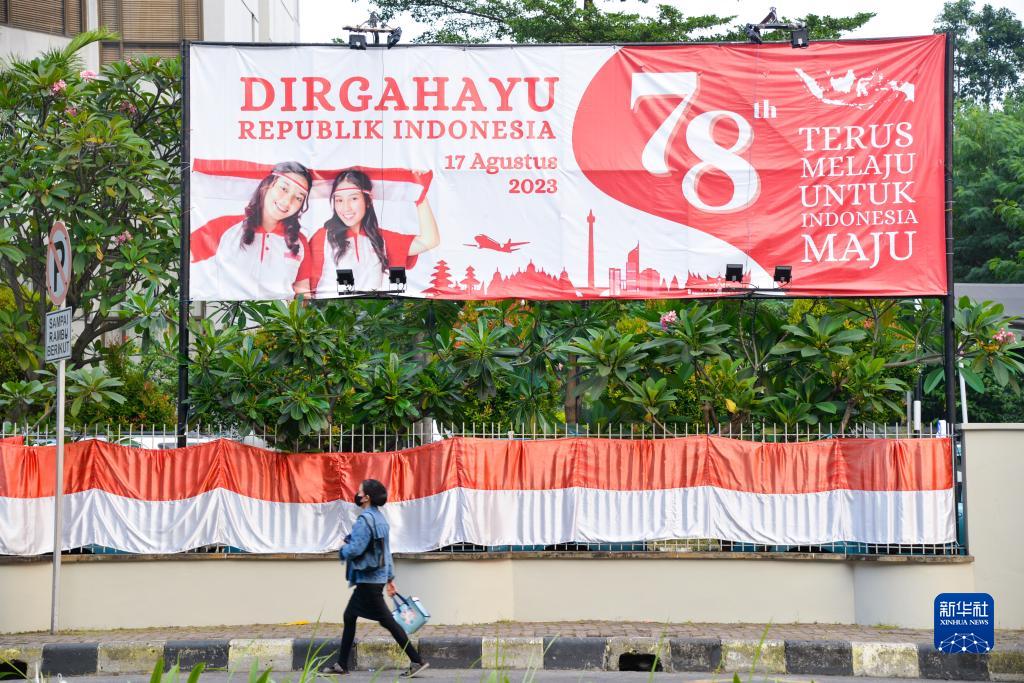 8月15日,在印度尼西亞雅加達,行人經過獨立日宣傳海報。
