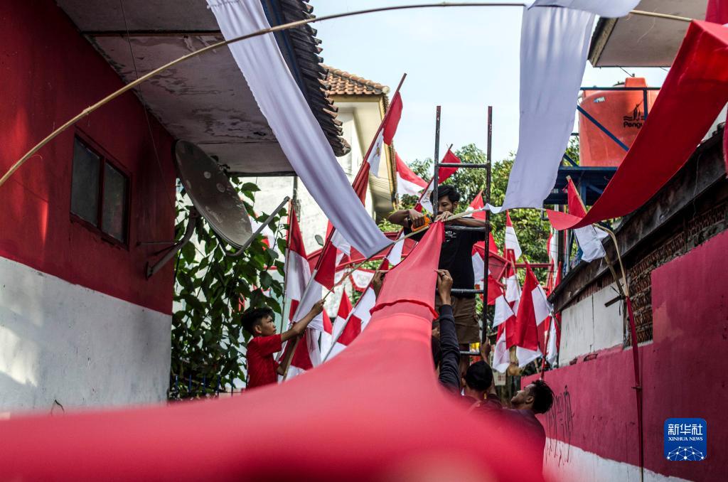 8月14日,在印度尼西亞萬隆,人們在居民區佈置印尼國旗元素裝飾。