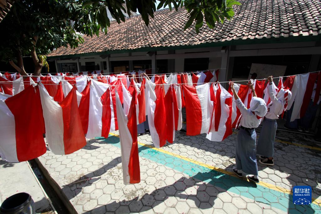 8月15日,在印度尼西亞斯拉根,學生們晾曬洗滌好的印尼國旗,準備用於佈置裝飾,迎接獨立日。