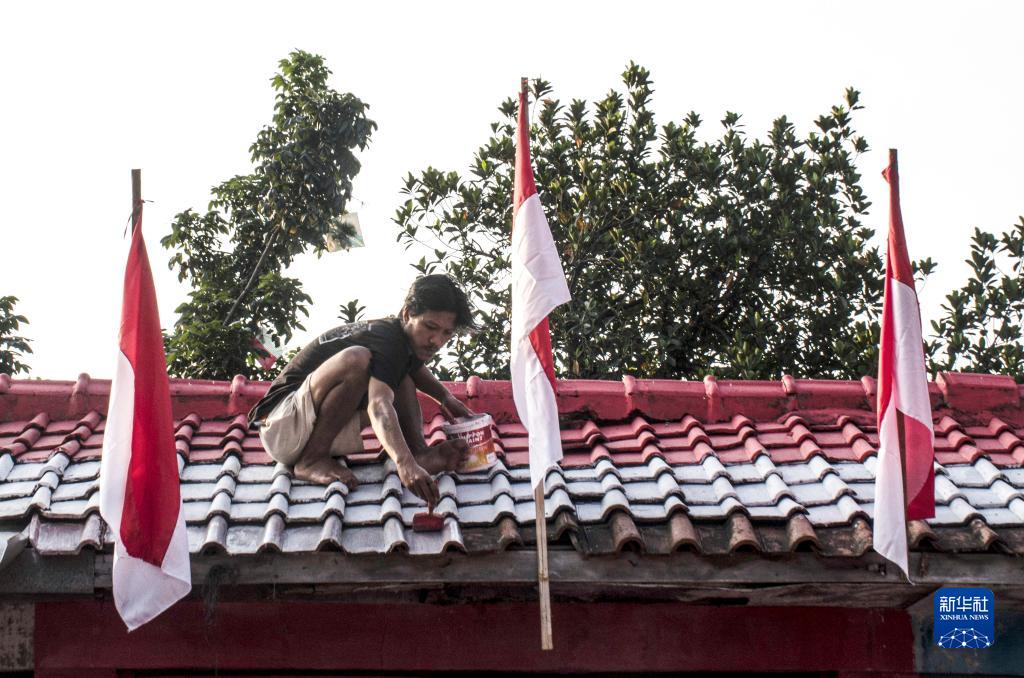8月14日,在印度尼西亞萬隆,一名男子將居民區一棟房子的屋頂瓦片涂成印尼國旗的顏色。