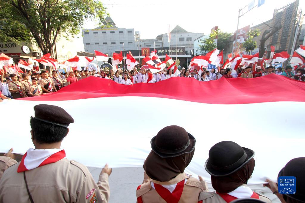 8月13日,在印度尼西亞梭羅,學生們在街頭舉着巨幅印尼國旗迎接獨立日。
