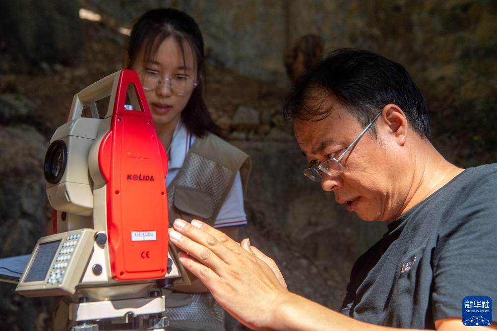 8月16日,工作人員在位於重慶市巫山縣廟宇鎮的龍骨坡遺址上開展勘測工作。