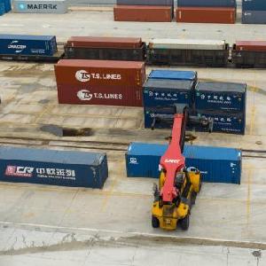 8月14日,在江西省贛州市南康傢具智能備料中心,工作人員操作車輛運送木料。