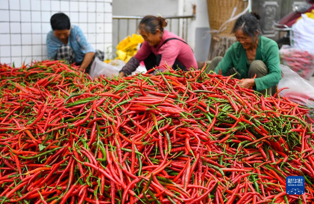 8月15日,重慶市石柱土家族自治縣龍沙鎮長坪村村民分揀鮮辣椒。
