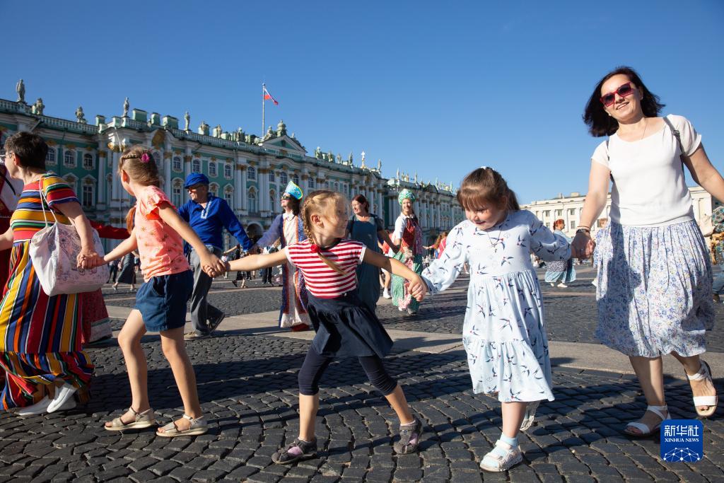 8月15日,民眾在俄羅斯聖彼得堡冬宮廣場跳圓圈舞。