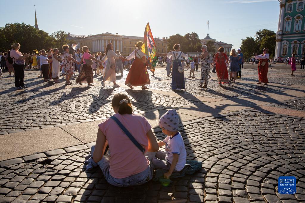 8月15日,在俄羅斯聖彼得堡冬宮廣場,一對母子坐在跳圓圈舞的民眾旁。