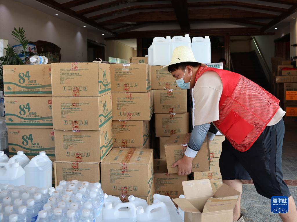 8月15日,工作人員在河北淶水縣三坡鎮防汛救災臨時指揮部搬運消殺物資。