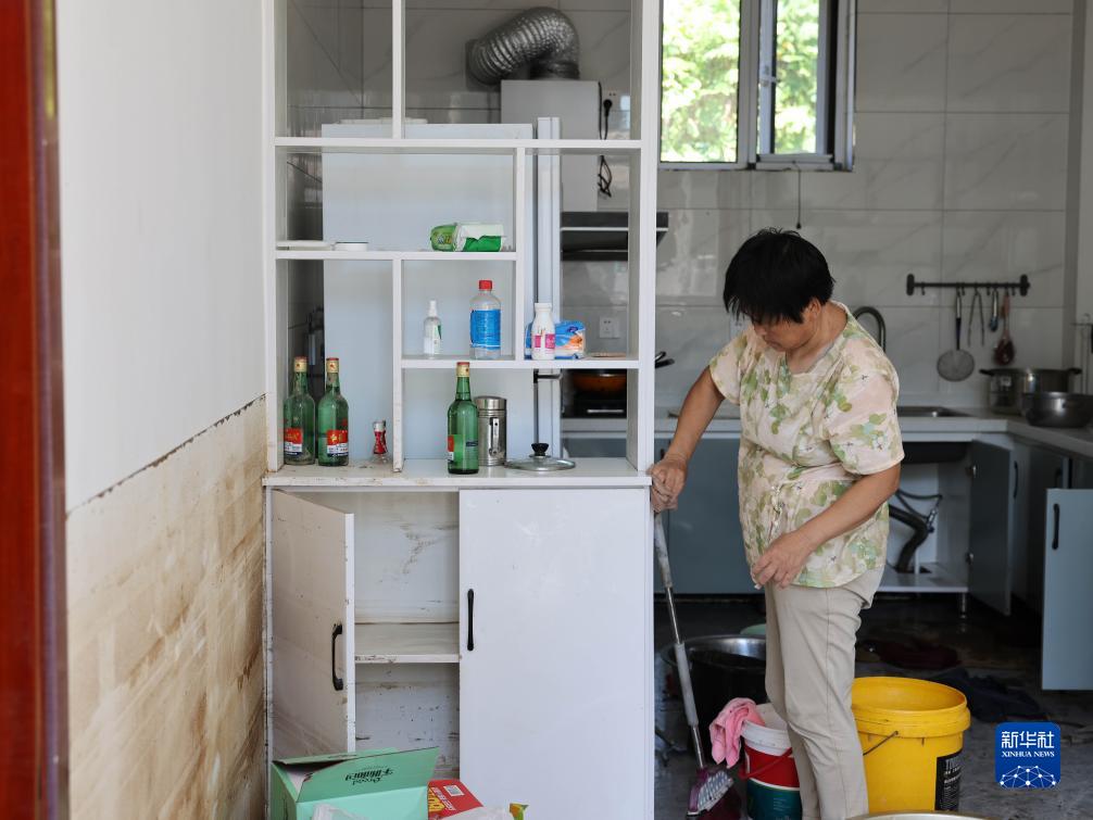 8月16日,河北淶水縣九龍鎮北龍門村村民在收拾清理家中物品。