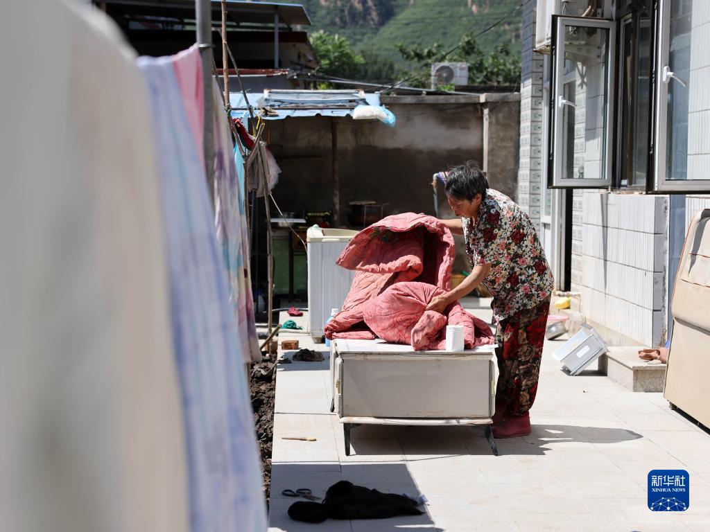 8月16日,河北淶水縣九龍鎮北龍門村的村民在晾曬被褥。