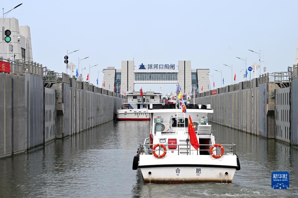 當日,在安徽省合肥市派河口水上服務區,隨着汽笛鳴響,一艘艘輪船從這裡緩緩駛出,向北駛向淮河,標誌着引江濟淮工程航道江淮溝通段開啟試運行。