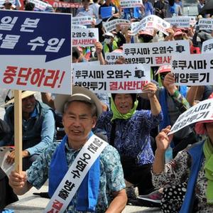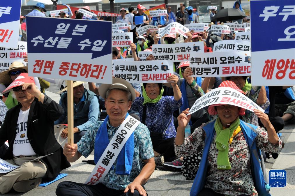 8月16日,在韓國全羅南道高興郡沿海一帶,韓國漁民手持標語參加集會活動,抗議日本核污染水排海計劃。