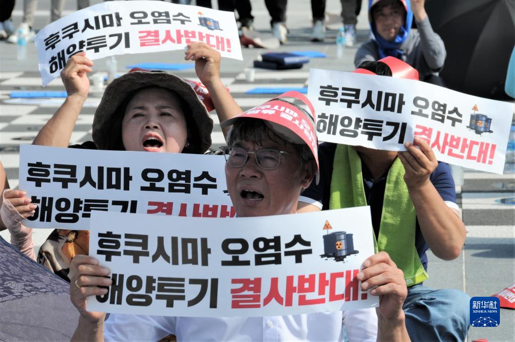 8月16日,在韓國全羅南道高興郡沿海一帶,韓國漁民手持標語參加集會活動,抗議日本核污染水排海計劃。