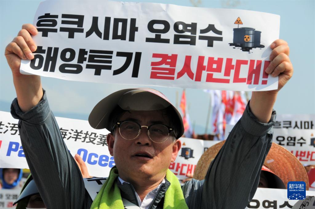 8月16日,在韓國全羅南道高興郡沿海一帶,韓國漁民手持標語參加集會活動,抗議日本核污染水排海計劃。