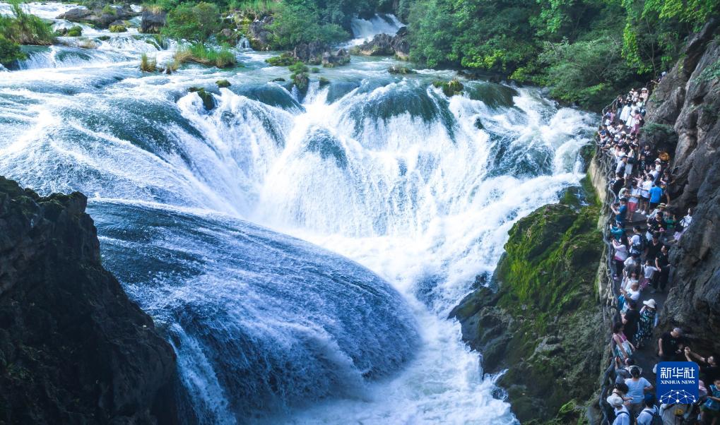 8月16日,游客在貴州省安順市黃果樹瀑布景區游覽(無人機照片)。