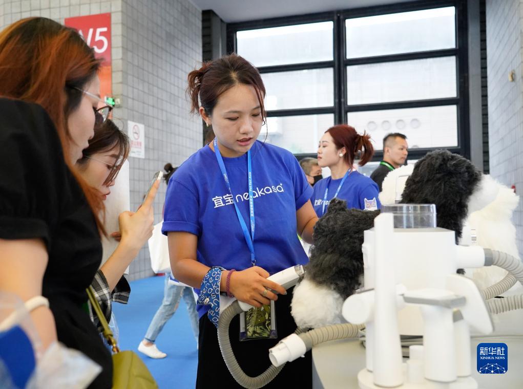 8月16日,在第25屆亞洲寵物展覽會上,參展商工作人員向觀眾演示寵物理毛器産品。