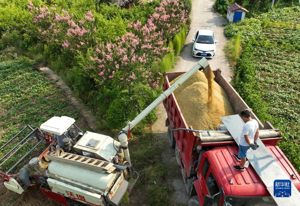 近日,四川東部廣安市近200萬畝水稻進入成熟收穫期,農民在田間忙碌,收穫水稻。