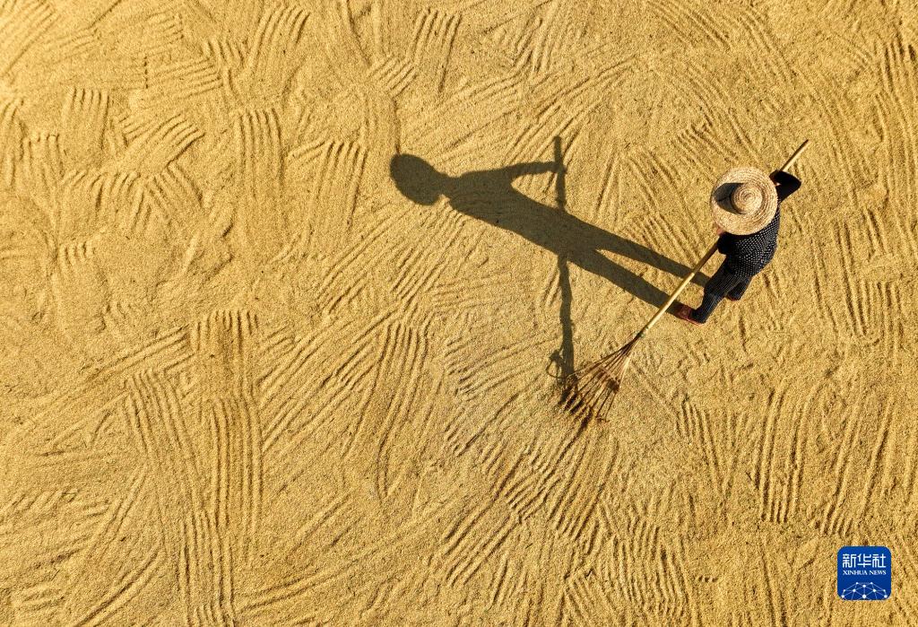 四川省廣安市華鎣市華龍街道東方村的農民晾曬從田間收穫的稻穀(無人機照片,8月15日攝)。