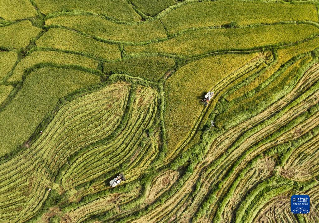 近日,四川東部廣安市近200萬畝水稻進入成熟收穫期,農民在田間忙碌,收穫水稻。