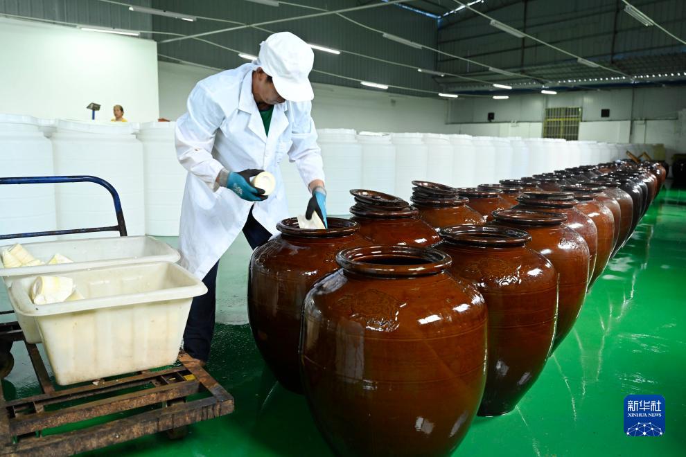 8月16日,在廣西柳州市柳城縣沙埔鎮古仁村酸筍加工廠,工人在車間裏腌制酸筍。