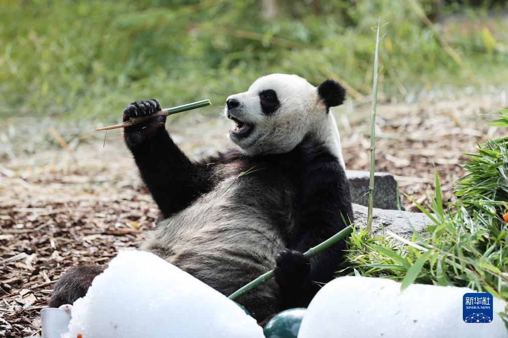 8月16日,在比利時布呂熱萊特的天堂動物園,大熊貓“寶弟”享用“生日大餐”。