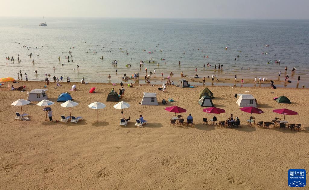 8月16日,游客在山東省萊州市三山島的海濱風景區游玩(無人機照片)。