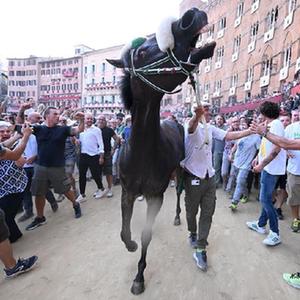 8月16日,在意大利錫耶納,人們聚集在獲勝馬匹周圍。