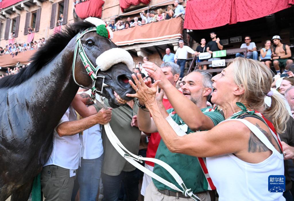 8月16日,在意大利錫耶納,人們撫摸獲勝馬匹。
