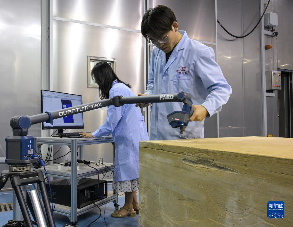在敦煌研究院多場耦合實驗室中,工作人員對慶陽北石窟寺砂岩樣品進行三維掃描分析(8月3日攝)。
