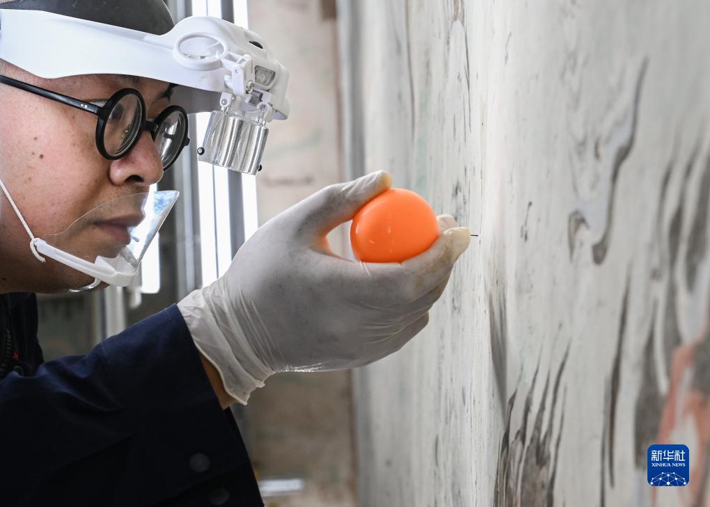 在敦煌莫高窟正在保護修繕的第55窟內,文保工作者對壁畫進行加固修復(8月3日攝)。