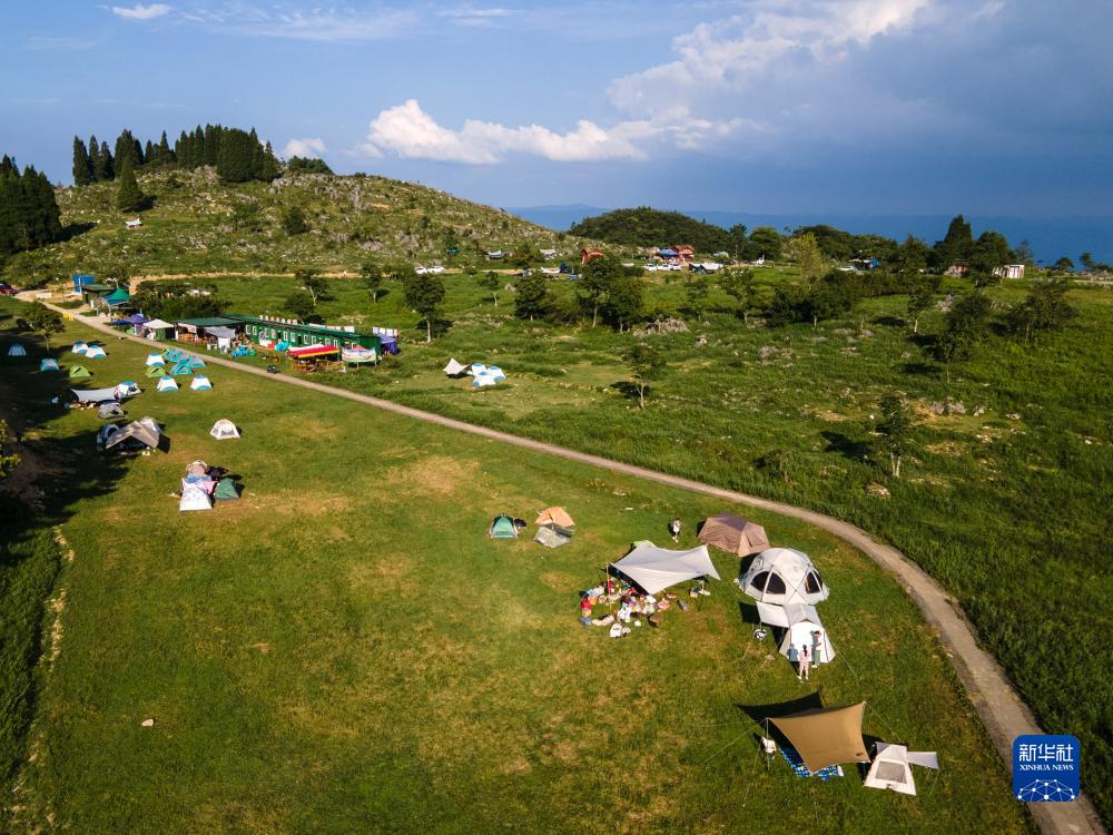 這是8月16日在重慶市石柱土家族自治縣魚池鎮拍攝的千野草場景區露營基地(無人機照片)。