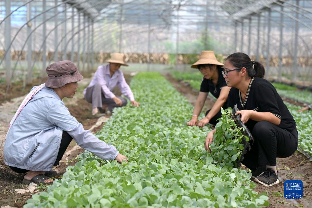 8月16日,余青青(前右)在樅陽縣青園心家庭農場和工人一起查看菜苗生長情況。