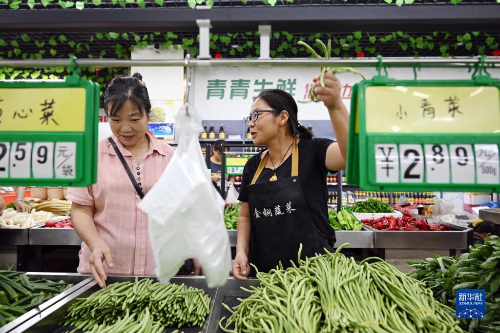 8月17日,余青青(右)在樅陽縣青園心生鮮食品配送中心向顧客介紹商品。