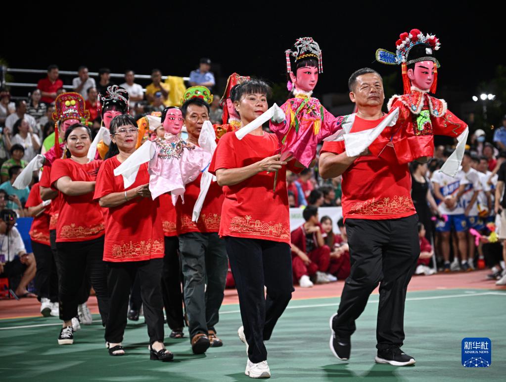 在“村排”決賽現場,演員帶着具有文昌特色的公仔戲木偶亮相球場(8月13日攝)。