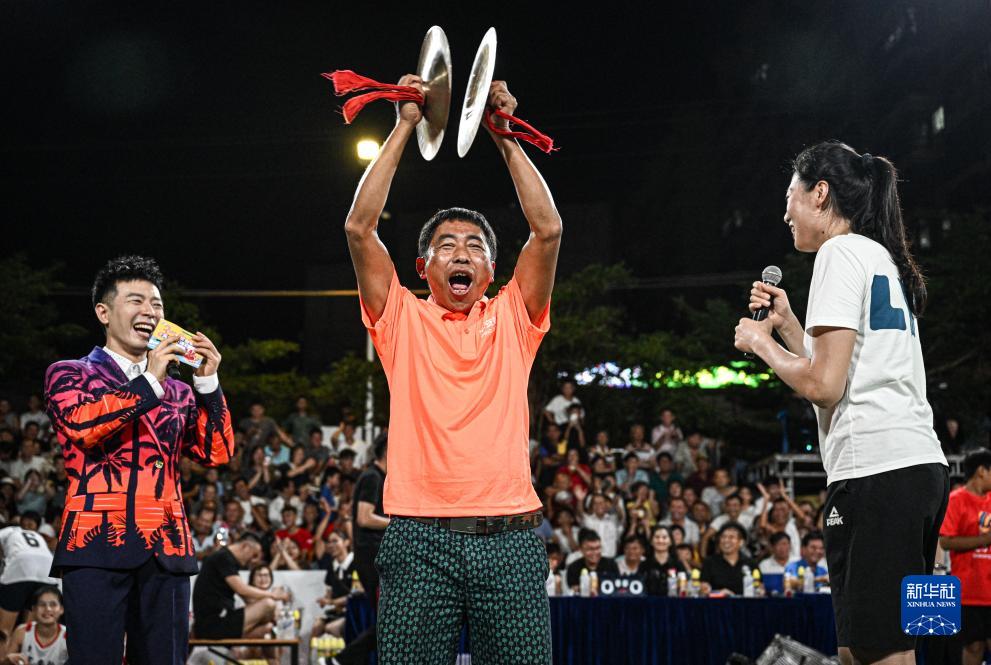“村排”鋪前站比賽期間,龍樓鎮隊教練黃梓(中)與前中國女排球員劉晏含互動交流(7月21日攝)。
