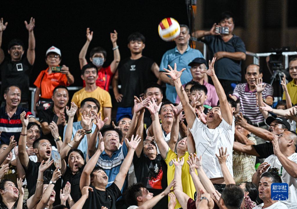 “村排”決賽現場,觀眾在賽前互動中爭搶前中國女排隊員魏秋月、李穎的簽名排球(8月13日攝)。