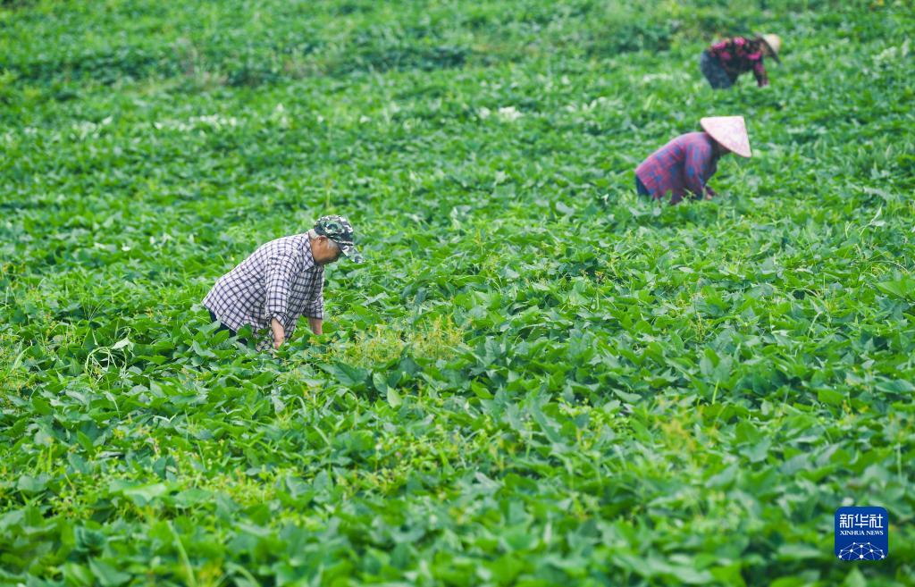 8月16日,村民在重慶市石柱土家族自治縣王家鄉光華村紅薯地裏勞作。